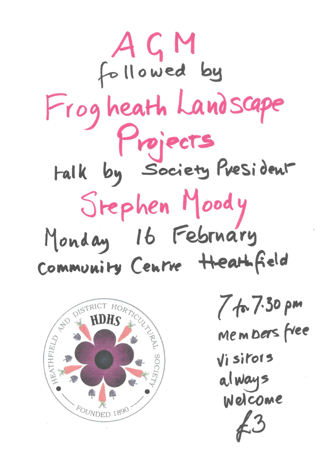 AGM followed by Frogheath Landscape Projects and talk by Society President Stephen Moody at Heathfield Community Centre