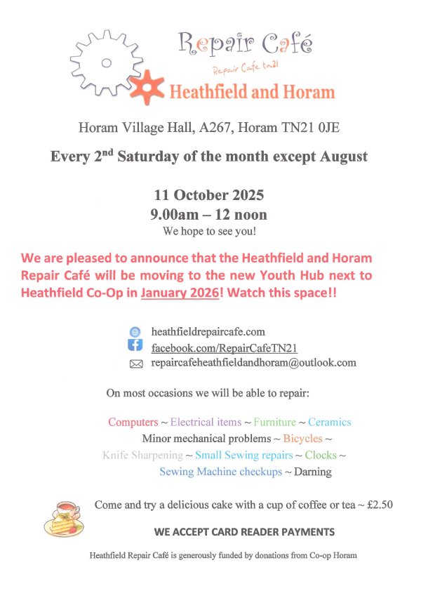 We are pleased to announce that the Heathfield and Horam Repair Café will be moving to the new Youth Hib next to Heathfield Co-Op in January 2026!