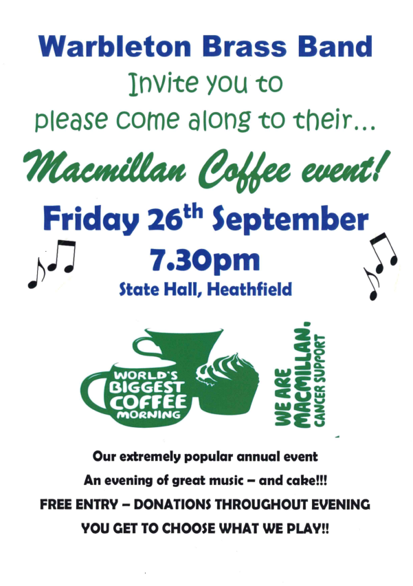 Warbleton Brass Band invite you to please come along to their….Macmillan Coffee event!